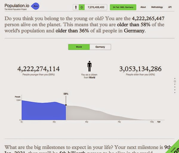 في الوقت الحاضر هناك ما يقرب من 7 مليار شخص الذين يعيشون على هذا الكوكب . لهذا إذا كنت فضوليا وتريد معرفة مكانك بين هذا العدد الكبير من الناس ، فلابد إذن ان تقوم بزيارة لهذا الموقع الذي يعطيك مجموعة من المعلمومات المثير عنك ، كالعمر الافتراضي ، والعام الذي ستتوفى فيه (العلم لله طبعا) وهل سيتغير هذا الوضع لو ولدت في مكان آخر من العالم إلى غيره من المعلومات والبيانات التي ادعك تكتشفها بنفسك .