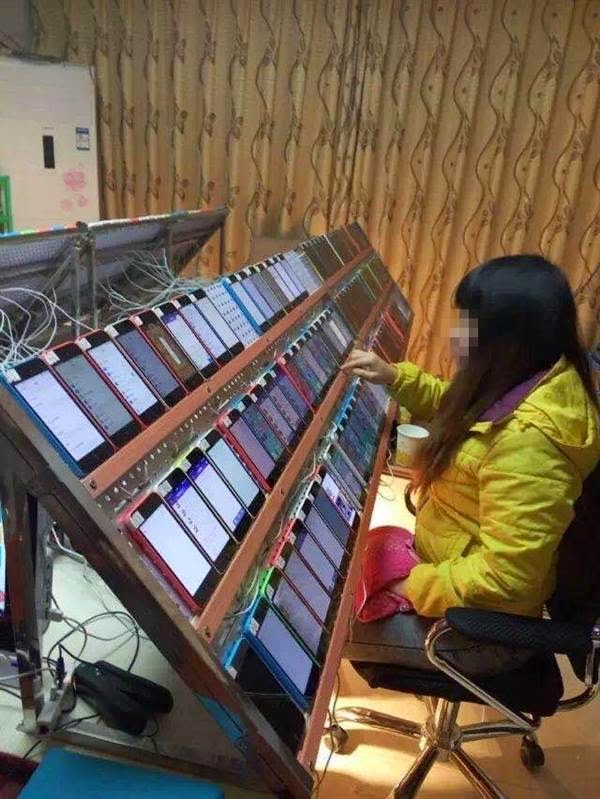 هذه الخدمات كذلك تحقق لأصحابها مبالغ مهمة ،لكن البعض يستعمل الروبوتات للقيام بذلك أو يستعين بطرق ملتوية اخرى التي قد تأتي بنتيجة عكسية لتطبيقك. لهذا عزيزي القارئ لا تستغرب عندما تجد الصينين في هذا المجال ويقدمون هذه الخدمة بشكل غريب شيئا ما فكما ترى في الصورة أدناه هذه الشركة الصينية تقوم بتقديم خدمة رفع ترتيب تطبيقك على متجر “آبل ستور” بأجهزة حقيقية وليس وهمية :