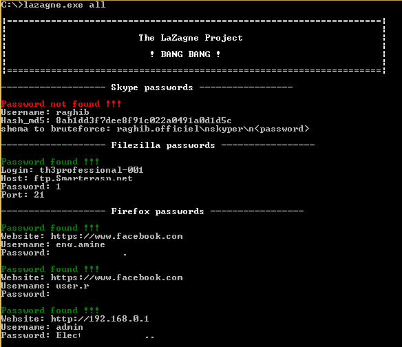 LaZagne هي عبارة عن اداة صغيرة يمكنك إستعمالها من اجل إستغراج جميع باسوردات ويندوز ولينكس بكل سهولة ، هذه الاداة يمكن ان تقوم بإستخراج جميع باسوردات الويفي و الباسوردات المخزنة على فايرفوكس . (لا اعتقد انها تعمل عل جوجل كروم ) ، بالإضافة إلى انها تدعم عدد كبير من البرامج على الويندوز مثل سكايب وبرامج الــ FTP وكذلك الويفي … الخ